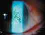 - Next, instill fluorescein and evaluate the dye pattern with the biomicroscope. An HSV-1 dendritic lesion stains brightly and the fluorescein absorbs slowly into the surrounding tissue (see middle photo on pg. 49). Rose bengal or lissamine green presents a distinctive stain pattern. Most lesions will stain faintly in the center, darker at the border and again fainter or less dense outside of the border. Note the typical rose bengal stain pattern in the top photo below.