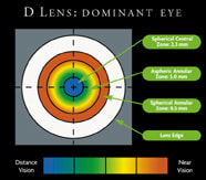 The real advantage to this lens design involves the integration of a distance-centered lens for the dominant eye and near-center lens for the non-dominant eye. The distance-centered lens integrates a 2.3 mm spherical distance prescription; the near-centered lens has a 1.7 mm spherical near prescription in the center. The distance center lens design usually needs a +0.25 added to the distance prescription while the near-centered lens requires -0.25 added to the distance prescription.