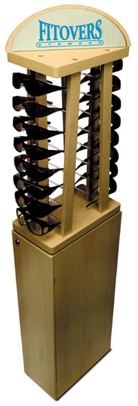 Fitovers Eyewear presents a new 16-piece revolving display designed to highlight its fitover style sunwear in the optical shop setting. The display is set on a revolving base to provide maximum exposure with minimal space requirements and is available as a counter or floor stand; the floor stand version incorporates a lockable storage cupboard at its base. Graphics detail the fitover concept of sunwear for prescription eyeglass wearers. The display comes in a light oak finish; it's available free of charge to fitovers retailers with minimum purchase.