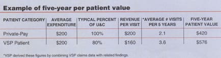 So while an optometrist may have to discount services to participate in the plan, the long-term value to the practice is greater with VSP involved. In the box below, you'll find that instead of a $40 loss in revenue per patient per visit, the doctor realizes a $156 gain over a five-year period with the VSP patient.