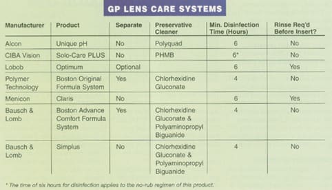 "GP Lens Care Systems" (pg. 66) summarizes a representative sample of GP lens care systems used in the United States. Use abrasive cleaners with caution in conjunction with high-Dk lens materials. With the exception of SOLO-care PLUS, the GP lens care systems are not compatible with hydrogel lenses and you therefore shouldn't use them with hybrid or piggyback lens care systems.