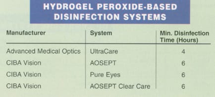 "Hydrogel Peroxide-Based Disinfection Systems" summarizes a representative sample of oxidative hydrogel lens care disinfection systems used in the United States. Oxidative lens care systems use 3% hydrogen peroxide and have maintained a steady presence in the lens care market because of their known antimicrobial efficacy and preservative-free nature.