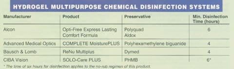 "Hydrogel Multipurpose Chemical Disinfection Systems" summarizes a representative sample of chemical hydrogel lens care disinfection systems that patients in the United States use. These systems combine cleaning, rinsing, disinfection, storage and protein removal. All have demonstrated some degree of efficacy without digital cleaning.