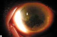 CIN lesions stain with Rose Bengal, which may help delineate the extent of the abnormal tissue margin. You can also use Rose Bengal to distinguish between CIN and pterygium or pannus. The CIN lesion should move freely over the underlying episcleral tissue, whereas invasive SCC has deeper involvement and is fixed to the underlying tissue. Also, invasive SCC tends to appear larger and more vascular. You can see prominent feeder vessels in both CIN and SCC.