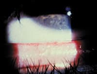 The use of red-free illumination enhances the contrast of the red line of injected vessels at the most posterior aspect of the lid margin. The irregular lid surface and swollen gland openings is also apparent in this patient, who had been on long-term Accutane therapy. |