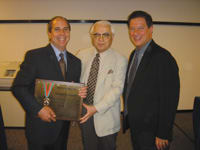 Gerard Santinelli, left, president and chief executive officer of Santinelli International, received an award of recognition for his support of the Special Olympics Lions Club International Opening Eyes at a recent Nidek Worldwide Summit meeting. The program works to improve the vision care of persons with disabilities throughout the world. With Mr. Santinelli are Hideo Ozawa, of Nidek (middle) and Dr. Paul Berman of the Special Olympics. |