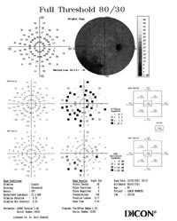As for our patient, her peak untreated IOP was 16mmHg O.U., so I set a target IOP of 11mmHg, about 30% lower. I prescribed Betoptic S (betaxolol hemihydrate, Vistakon) O.U. bid, but this only lowered IOP to 13mmHg. I changed her medication to Xalatan (latanoprost, Pfizer) O.U. qhs and the IOP reached 11mmHg with great consistency. Despite this "good" IOP, the patient developed a VF defect three years later (See VF images at left). Rather than add another drop, which may have affected her compliance, I opted to try Lumigan (bimatoprost, Allergan) O.U. qhs, in place of Xalatan. This helped achieve a consistent IOP under 10mmHg.