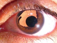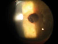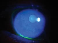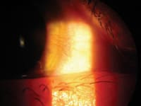 Once the settings are correctly adjusted, use a slit lamp to focus the area of interest just as during an exam. Instruct the patient to fixate on a point and try not to move. Lock the slitlamp into position. I tend to take better-focused photographs when I set a transilluminator on the slit lamp table. It lights the area of interest in addition to the slit lamp beam. The camera is then brought up to the ocular. Either the right or the left one will work fine. Once up to the ocular, the camera lens needs to be roughly one inch from the ocular in order to maintain an optimal field of view. A finger works well, both as a stabilizer and a spacer. It can be difficult to feel comfortable doing this at first, but with practice, it becomes much easier. I take several photos in order to secure two or three good photos for printing in their chart.