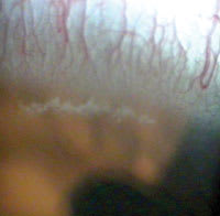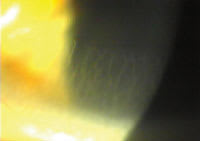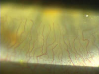 | Patients with corneal microcysts (top) almost always show signs of hypoxia such as corneal neovascularization (bottom) and edema. |