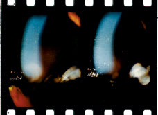 This stereo photograph shows three keratic precipitates on the inferior corneal endothelium. |