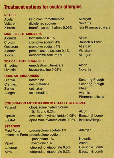 Another common form of therapy used to manage ocular allergies is the mast cell stabilizer. Mast cell stabilizers prevent mast cells from degranulating, which also prevents histamine from escaping, thus forfeiting the cause of the allergic reaction. One of the benefits that mast cell stabilizers provide is the ability to offer long-term relief to the patient. Typically, this category of drugs is quite effective when dosed bid. Despite the benefit of the drug dosage schedule, one of the pitfalls of mast cell stabilizers are that they take at least two weeks of consistent dosage before the patient experiences the benefit of the drug.