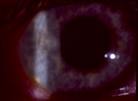 This image, captured with 35mm camera, was taken after removing the large, raised, white area of tissue in the center of the ulcer by corneal culture scraping. While blurred, the ulcer was surrounded by a dense 2mm ring of infiltrates. |