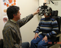 Dr. Tocker measures "agudeza visual" (visual acuity) with a phoropter. |