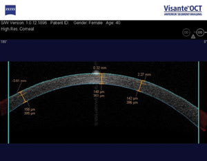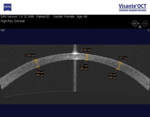 Postoperatively, high resolution corneal scans detail the actual thickness of the flap and the residual stroma. This is useful in considering an enhancement to ensure enough residual stroma remains after the enhancement. For instance, this patient (see figure 3, below) had LASIK in Peru six years prior to presenting to us with -2.00D. Her medical file was unattainable so there was no preoperative or intraoperative information available to us. We could perform the ultrasound pachymetry, but there would be no differentiating between the flap and the stromal bed thickness. Alternatively, we could take this patient into the operating room, lift the flap, perform the ultrasound pachymetry on the stromal bed, and if there was enough stromal bed, we could then perform the excimer enhancement. On the other hand, if the stromal bed was insufficient, we would have had to replace the flap and send the patient home. With the OCT scan, we can measure the residual stroma non-invasively. We performed an OCT scan on this patient and were able to locate her flap-bed interface. Using the measuring tools in the OCT software we measured the residual stroma at 351 microns, enough for a -2.00D enhancement.