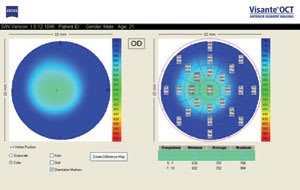 When examining corneal thickness, probe placement and repeatability can be an issue in detecting or following keratoconus. If a patient's corneal thickness shows a decrease a year later, is it because the probe was placed in a different spot or is it true thinning? The OCT maps the corneal thickness in 25 spots across the