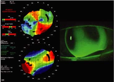 Fitting hydrogel and silicone hydrogel contact lenses is relatively straightforward. Most practitioners dont rely on cor-neal topography fitting software to select the appropriate contact lens base curve for these patients. Certainly topography maps obtained prior to lens application are extremely important to rule out conditions, such as displaced corneal apex, keratoconus, pellucid marginal degeneration and distorted corneas. Their value in the routine cosmetic contact lens fitting (GP or soft lenses), however, is to establish a baseline corneal map from which you can evaluate changes in curvature as contact lens wear progresses. Specifically, look for contact lens-induced corneal distortion, which has been shown to occur in both soft and rigid contact lens wear.