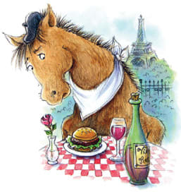 French friends later told us that "hamburger du cheval" is a beef hamburger, with an egg riding on top like a jockey. However, I think she still was convinced that I had caused her to consume a horseburger.