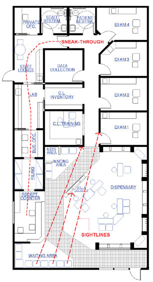 "With a circular flow, you bring patients into the exam areas in one direction, they go through the pre-testing area, enter the exam room and then go out the other end to the optical or to the contact-lens fitting section," he says. "A circular flow avoids congestion in the hallway, which, in turn, really improves practice efficiency."