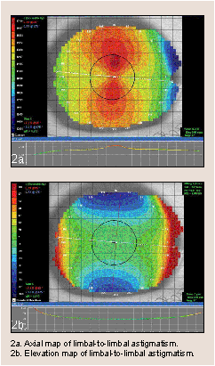 Limbal-to-limbal astigmatism. Patients with high amounts of limbal-to-limbal astigmatism require precise fitting of soft-toric or bitoric gas permeable (GP) lenses. The axial map provides you with the best view of the location and amount of astigmatism. An elevation map illustrates the expected fluorescein pattern beneath the best-fit sphere or reference sphere on that cornea (see figures 2a and 2b, page 38). When the toricity stretches from limbus to limbus, a bitoric GP provides better stability by matching the different corneal elevations. You don't see the typical toric fluorescein pattern on patients who have apical astigmatism. These patients may be better fit with a spherical GP lens which aligns well with the spherical peripheral cornea.