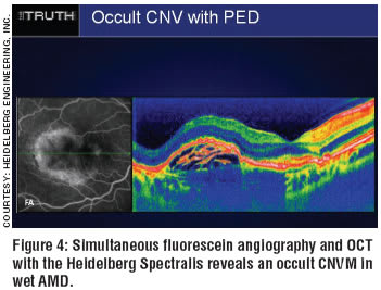 A patient presented with wet age-related macular degeneration (AMD) and had an occult choroidal neovascular membrane below the RPE, which was therefore not directly visible via BIO (see figure 4). Angiography (using either fluorescein or indocyanine green dye) is crucial in detecting these types of membranes, but the simultaneous OCT image provides a real-time, in-vivo localization of the choroidal neovascular membrane. This is important because you can now see the extent of the lesion beneath the retina.