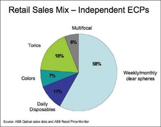 The national averages for retail sales by category among independent eyecare practitioners (ECP): Weekly/monthly clear spheres account for 57% of sales, soft torics account for 18%, daily disposables account for 11%, colors account for 7% and multifocals account for 6%. Within the large clear sphere segment, the lower-priced, two-week and monthly replacement HEMA lenses still account for 38% of sales during 2007.