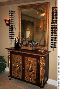Optometrist Jacqueline Campisi, of Visions Sight & Learning Center in Mystic, Conn., says the most outstanding part of her Egyptian-themed practice is the pyramid-shaped waiting area and domed ceiling of the optical boutique (right). "A floor-to-ceiling mural of a doorway peering out at the desert backdrop from the pyramid catches patients' eyes as they approach the reception area," she says. "Wall sconces produce a low amber glow, as if the pyramid were lit by torches, and frame displays are made from imported Egyptian furnishings." The location of Dr. Campisi's practice was key to her success. Situated in the lower corner of a medical complex, the practice has 40-feet of window frontage facing a Starbucks.