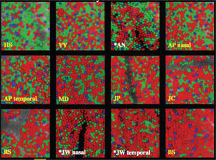 Arrangement of short-, middle- and long-wavelength-sensitive cones in human foveal mosaics.