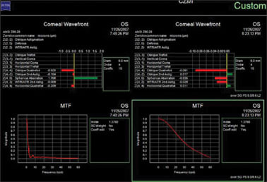 Wavefront aberrometry can also provide information about modulation transfer function, which is a measure of contrast sensitivity in cycles per degree. An increase in cycles per degree signifies an increase in contrast sensitivity. Patients with poor contrast sensitivity will show a decrease in cycles per degree. Keep in mind that in order to accurately view the effects of higher-order corneal aberrations on quality of vision, you must mask the lower-order aberrations of defocus and astigmatism. You can usually do this simply by checking off these coefficients on your topographer's Zernike table or pyramid.