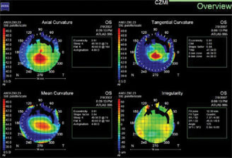 • The axial, or sagittal, map. This map supplies a general view of the anterior curvature of the cornea, providing a basic idea of the overall corneal shape. It also defines astigmatism as regular or irregular as well as oblique, apical or limbus-to-limbus. Further, the axial map reveals the presence of keratoconus or keratoectasia.