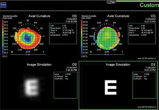 Figure 5: A custom display of post-radial keratotomy regression. Axial maps are used to show the difference in corneal curvature with and without a hybrid contact lens on the eye. The corresponding image simulation shows the improvement in quality of vision with the lens on the eye.