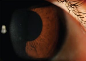 The patient's left eye revealed obvious subepithelial infiltrates of varying sizes as well more pronounced PEE and punctate epithelial keratitis (PEK) (see figure 2).