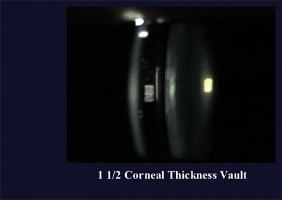 In addition, as part of the candidate selection process, we need to check the vault. Using the slit lamp, we see the cornea's overall thickness. With this reference point of 1, we can evaluate the vault space. It should always be at least 10% of the corneal thickness. If the vault is less than 10%, then I send the patient back to the surgery center for evaluation. The surgeon has to measure limbus to limbus to ensure the lens is long enough to bow away from the anterior surface to the left.