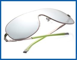 ■ Style KL104S is one of four styles that comprise the Karl Lagerfeld Sunwear collection, from Marchon Eyewear. This unisex style is made of metal/acetate and has a flat curved shield shape.