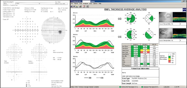 Figures 3 and 4. Throughout the course of treatment, visual fields and the retinal nerve fiber layer remained normal OU.