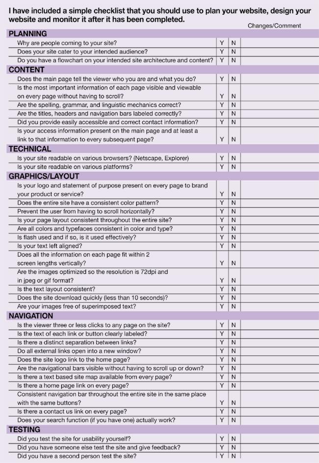 I have included a simple checklist that you should use to plan your website, design your website and monitor it after it has been completed (figure Website Design Table, above). OM
