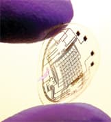 ► How would you like to look up a recent article in OM or an abstract on PubMed via your contact lens? Sound far-fetched? Not according to engineers at the University of Washington. They've been able to combine a flexible, biologically safe contact lens with an imprinted electronic circuit and red light-emitting diodes (L.E.D.s), which do not yet light up, with the ultimate goal of providing wearers with virtual displays. The engineers hope to power the lens via a combination of radio-frequency power and solar cells attached to the lens. Rabbits wore the lenses for up to 20 minutes without any adverse effects.