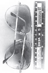 The police had the suspect's prior mug shots enlarged and their contrast enhanced. This allowed me to identify a number of unusual features that appeared to coincide with the spectacles in evidence. The lenses were poorly crafted; they had air spaces in the corners, and the right and left lens shapes were slightly mismatched — as if one lens had been chipped and re-edged. Also, the frame was an inexpensive metal construction with the lamination worn off where it touched the wearer's skin. Further, the glasses had faulty temple and nose pad adjustments.