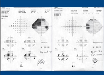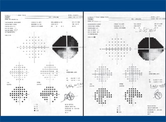 Figure 2. This patient's visual field shows profound loss with total ablation of the superior hemifield OU.