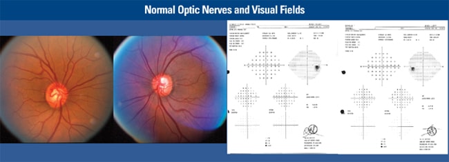 ■ Fundus evaluation: moderately large cup-to-disc ratio of .55/.55 for both cups, with sharp disc margins; neuroretinal rims were intact 360°. No retinal nerve fiber layer (RNFL) defects were observed