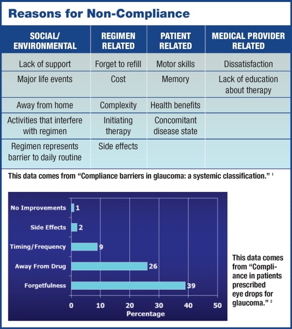 Getting our patients to adhere to their glaucoma drugs is an ongoing challenge. (See "The Importance of Instilling Adherence," below.) Among other reasons, motor skills, side effects, lack of education about therapy, forgetfulness, lack of and improvement in symptoms and cost have all been implicated as reasons for non-compliance (See "Reasons For Non-Compliance," below).1,2