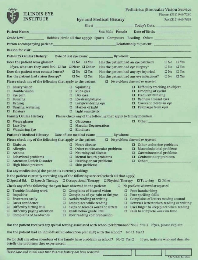 The Illinois Eye Institute Eye and Medical History form for children inquires about double vision, squinting and eye tracking anomalies, among other BV-related symptoms. (See below.) The Convergence Insufficiency Symptom Survey is comprised of questions regarding the occurrence of specific symptoms related to reading and close work, such as tired eyes; while the COVD Quality of Life Survey requires the patient to rate the occurrence of various BV symptoms, such as headaches and dizziness.
