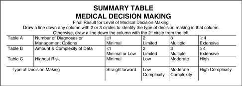 These are the four categories of Medical Decision Making: Straightforward, Low Complexity, Moderate Complexity and High Complexity. The complex method used for determining the level of Medical Decision Making is given (see Figure 2) based on those used by Medicare as audit guidelines. The selection of the proper category for the encount-er you are coding is calculated using Tables A, B and C.