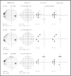 DP has been an excellent patient in terms of both medication compliance and return visits. She has been monitored every three months and until recently her IOP remained at or below target. During her two most recent assessments, however, DP demonstrated a slight progression in VF defect (see figure 4), which was verified with repeat examination. As a result, a carbonic anhydrase inhibitor was added to her regimen as adjunctive therapy, and she is considering selective laser trabeculoplasty (SLT).