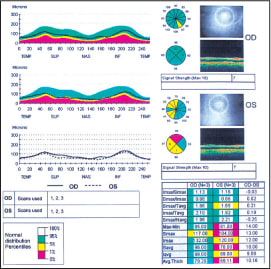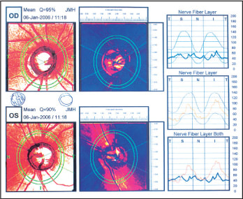The recent introduction of technologies, such as scanning laser polarimetry and optical coherence tomography (OCT, see figure 4), has greatly enhanced our ability to monitor subtle changes in the ONH and nerve fiber layer. In most cases, a baseline exam is obtained at the time of suspicion of glaucoma and then used to track changes through time. After the initial scan, subsequent exams are performed using the repeat function to ensure that similar scan parameters (scan placement, fixation and landmarks) are used for comparison.