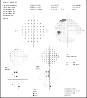 DP is a 65-year-old Caucasian female who first came to my office four years ago for a routine eye examination. Her medical history was unremarkable. Family history was positive for glaucoma. At the initial exam, corneal thickness was 540 μm in each eye, and intraocular pressure (IOP) was 19mm Hg to 20 mm Hg. Dilated fundus examination revealed increased cup-to-disc ratio. Based on these findings, the patient was diagnosed as a glaucoma suspect. Baseline evaluation with scanning laser polarimetry demonstrated poor modulation in the right eye and poor symmetry (see figure 1). Findings were 95 and 50 in the right and left eye, respectively. Visual field (VF) testing revealed arcuate defects in both eyes. Repeat VF testing confirmed the defects (see figures 2 and 3), at which point DP's diagnosis was changed from glaucoma suspect to primary open-angle glaucoma (POAG). The highest IOP measurement had been 22 mm Hg in each eye, so 16 mm Hg was chosen as the therapeutic target. DP was started on a prostaglandin OU daily before bedtime, and responded very well to therapy.