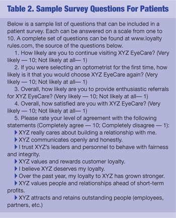 The same website includes a customer survey which you can adapt to your practice as well (see Table 2, below). Remember to keep the staff surveys anonymous. Patient surveys can be given to everyone if you would like, however Mr. Reichheld suggests in his survey tips (that are also on the website) that you may want to pay special attention to the results sent back by the 20% of patients that are responsible for 80% of your revenue. If you wish to benchmark your results of the two surveys, the results of the top-performing companies can be found under the “results” section on the website. OM
