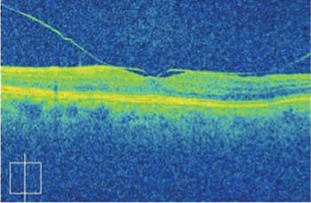 In the right eye, OCT showed the internal limiting membrane draping over a small collapsed cystoid change (Figure 1). This finding is known as the ILM drape and is observed in as many as 50% of eyes with type II IMT, according to Yannuzzi and colleagues.3 With the help of Cirrus HD-OCT, the patient was diagnosed with Type II idiopathic macular telangiectasis (IMT).