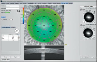The AS-OCT systems have varying options for pachymetry maps. The scanned area ranges from 4 mm to 8 mm in diameter, and some systems display segmented zones with minimum, average and maximum thickness (Figure 2). Unlike traditional ultrasound pachymetry, OCT pachymetry maps are free of compression and less sensitive to decentration artifacts and, thus, may provide more accurate values for calculating correction factors for glaucoma patients.3,4 Nomograms have been published that use AS-OCT pachymetry maps to allow practitioners to determine if a patient is a suspect for keratoconus.