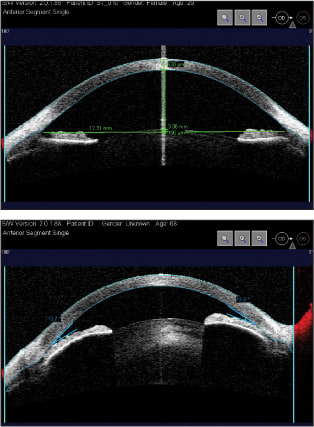Software tools in some of the systems also allow calculation of anterior chamber distance, angle-to-angle distance and other biometric measurements.3,7 Some clinicians also use AS-OCT to document flare and synechiae in the anterior chamber.