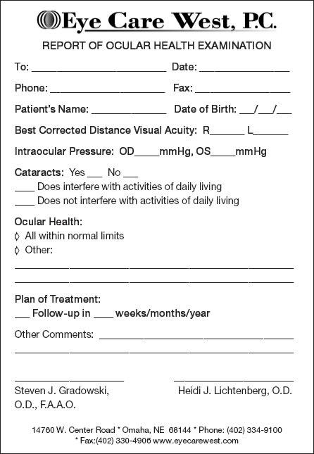 I fax a simple one-page report to my patients' other healthcare providers (see "Report of Ocular Health Examination," below.) The doctors to whom I've sent this report have not only thanked me for keeping them in the loop regarding their patient's care, but have also told me they've appreciated not having to pour over a lengthy report or return a phone call. I'm happy to say that, in many cases, establishing this type of communication has indeed blossomed into referrals for not only other suspected ocular allergy patients, but also other ocular conditions, such as age-related macular degeneration and glaucoma, among others.